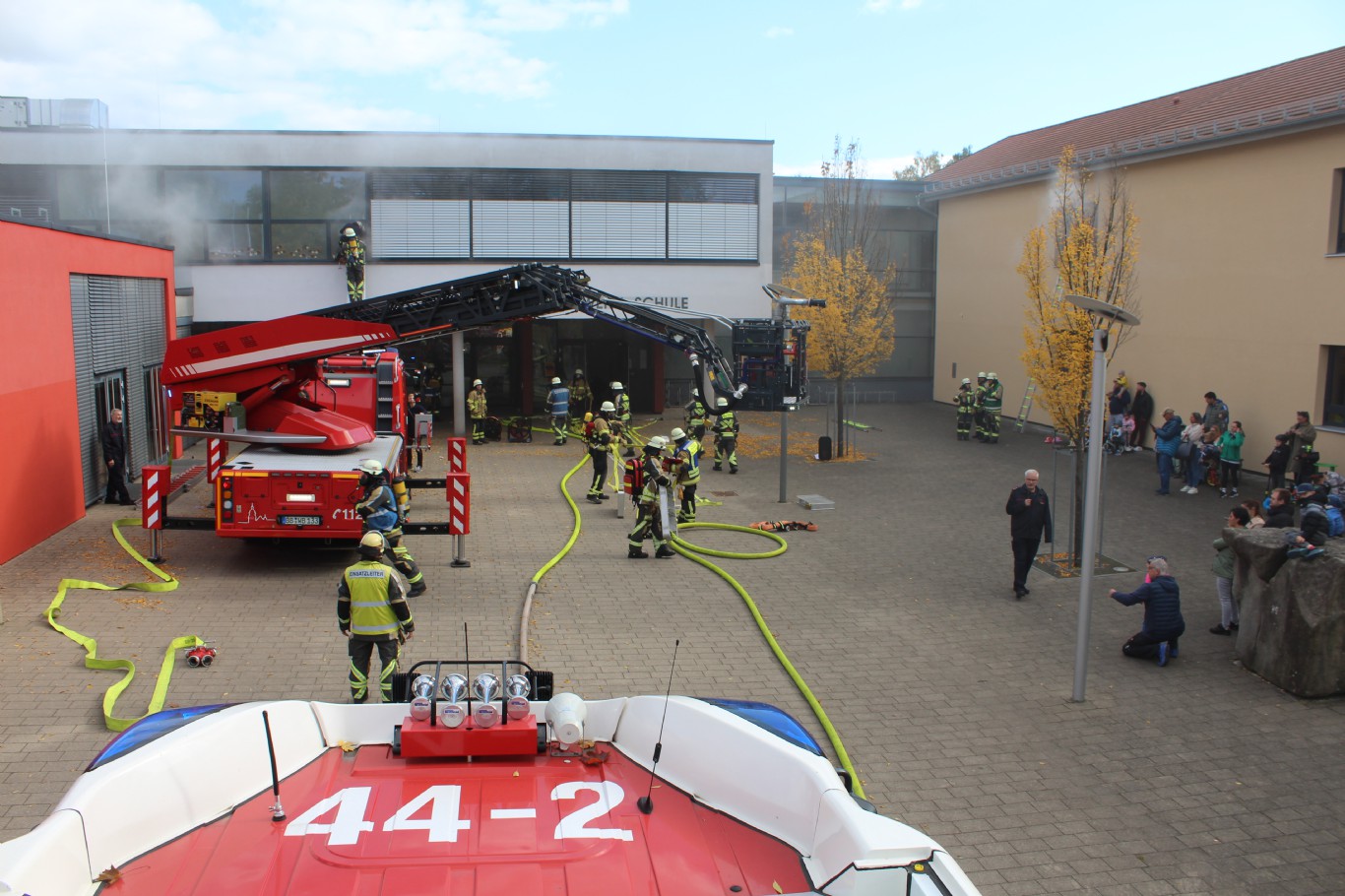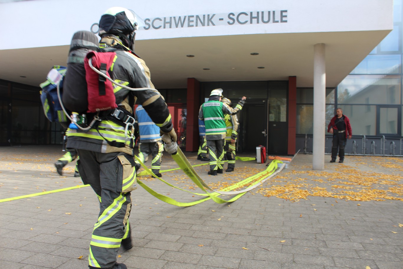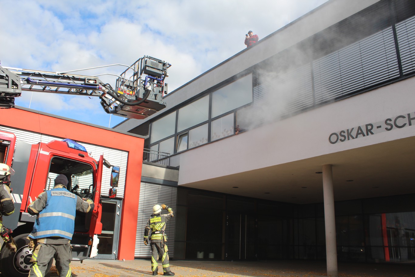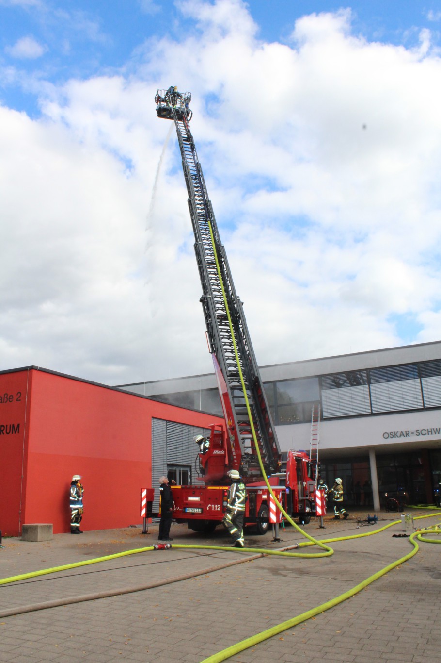 Die Übungsannahme war, dass bei Schweißarbeiten auf dem Dach beim Forum der Oskar-Schwenk-Schule ein Feuer ausgebrochen war. Zu dem Zeitpunkt befanden sich zwei Arbeiter auf dem Dach, die es über die Drehleiter zu retten galt.