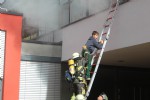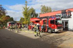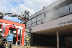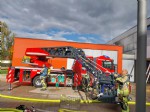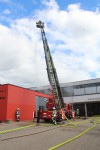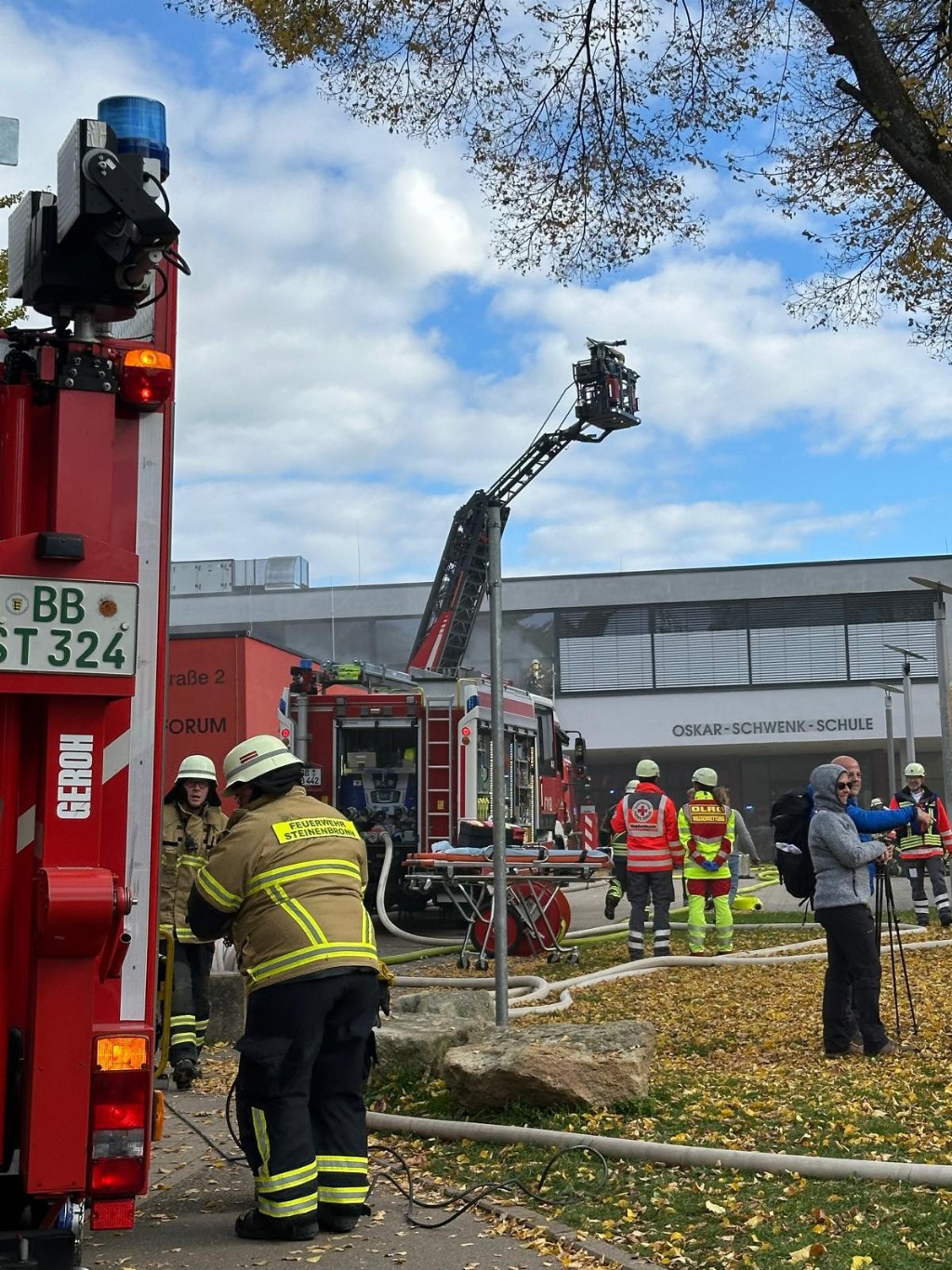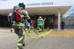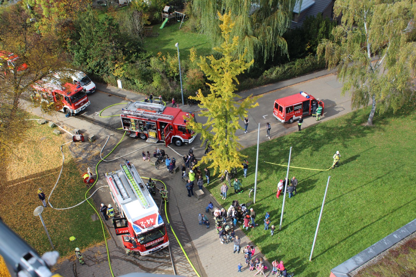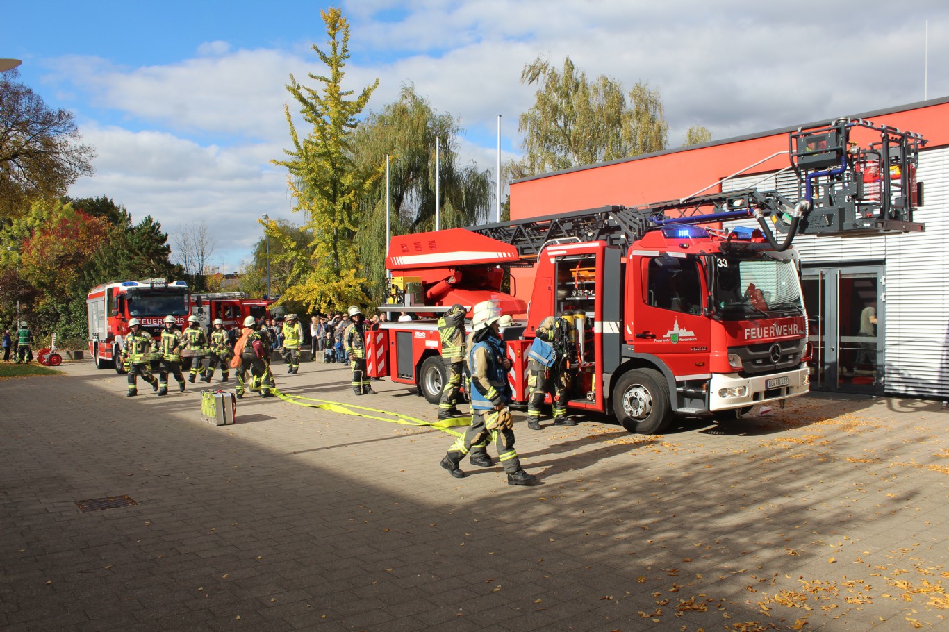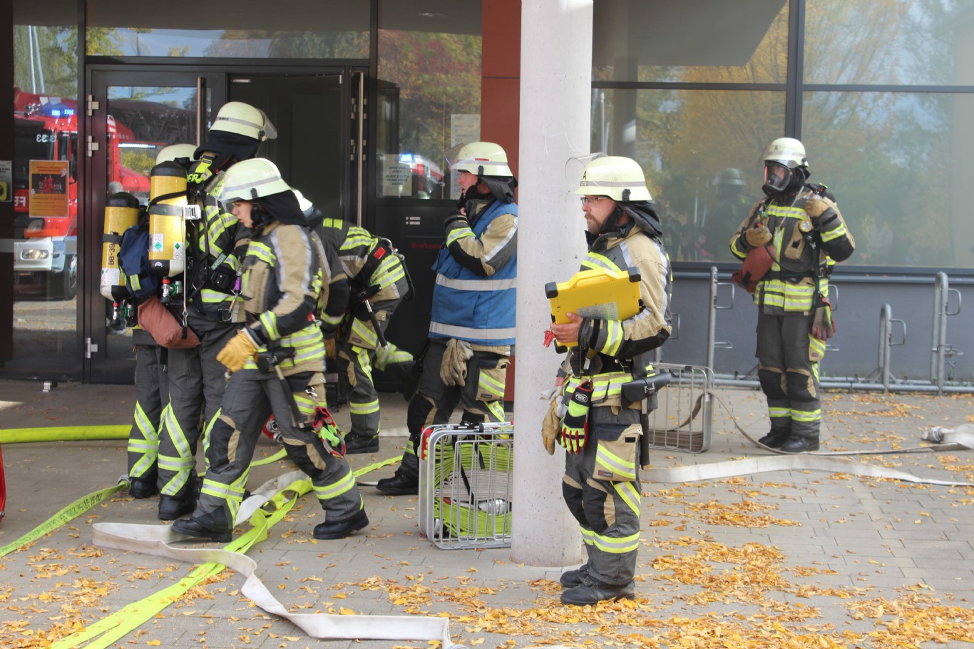 Die Übungsannahme war, dass bei Schweißarbeiten auf dem Dach beim Forum der Oskar-Schwenk-Schule ein Feuer ausgebrochen war. Zu dem Zeitpunkt befanden sich zwei Arbeiter auf dem Dach, die es über die Drehleiter zu retten galt.