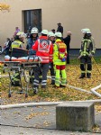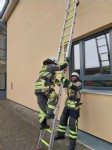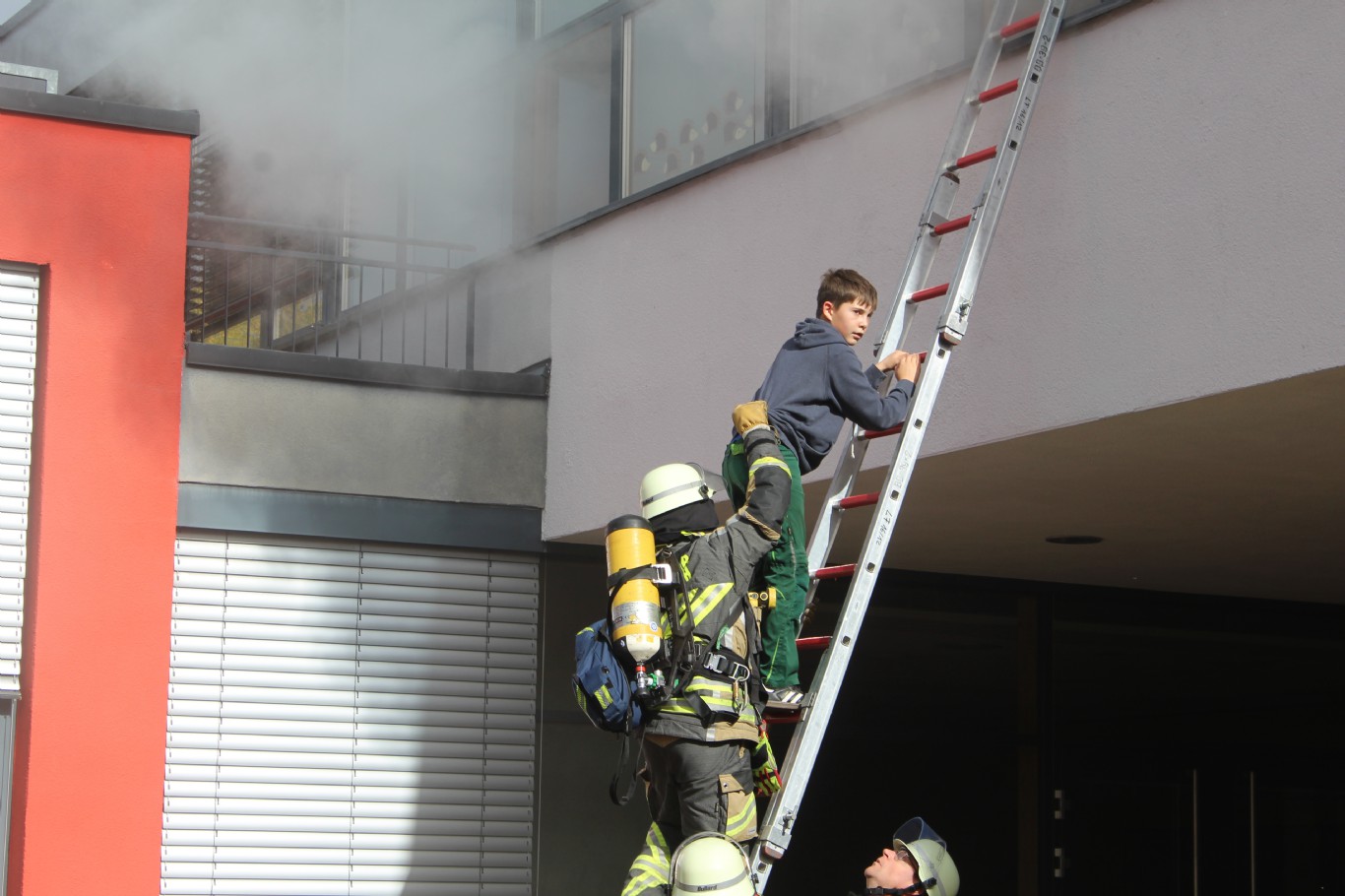 In der Folge wurde mit der Brandbekämpfung und der Menschrettung über tragbar Leitern und die Drehleiter begonnen. Die beiden Arbeiter vom Dach wurden in den Drehleiter-Korb geholt und so gerettet. Insgesamt neun weitere Personen wurden aus dem Gebäude gebracht, teilweise erfolgte dies über tragbare Leitern. Hierbei wurde die Waldenbucher Wehr von der Feuerwehr Steinenbronn mit einem Fahrzeug unterstützt, was auch bei einem realen Einsatz ebenfalls so ablaufen würde.