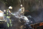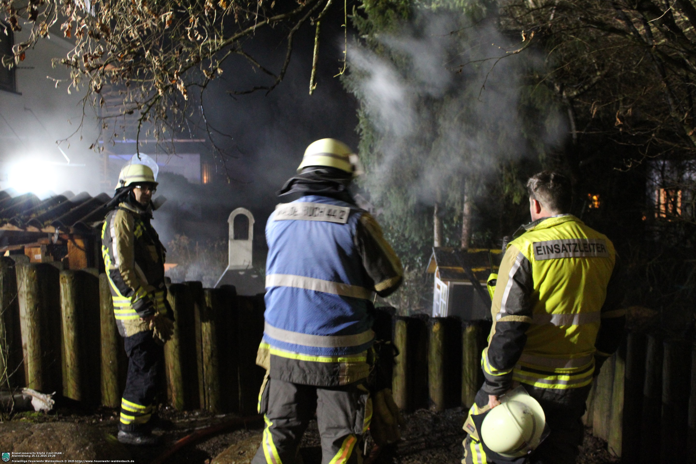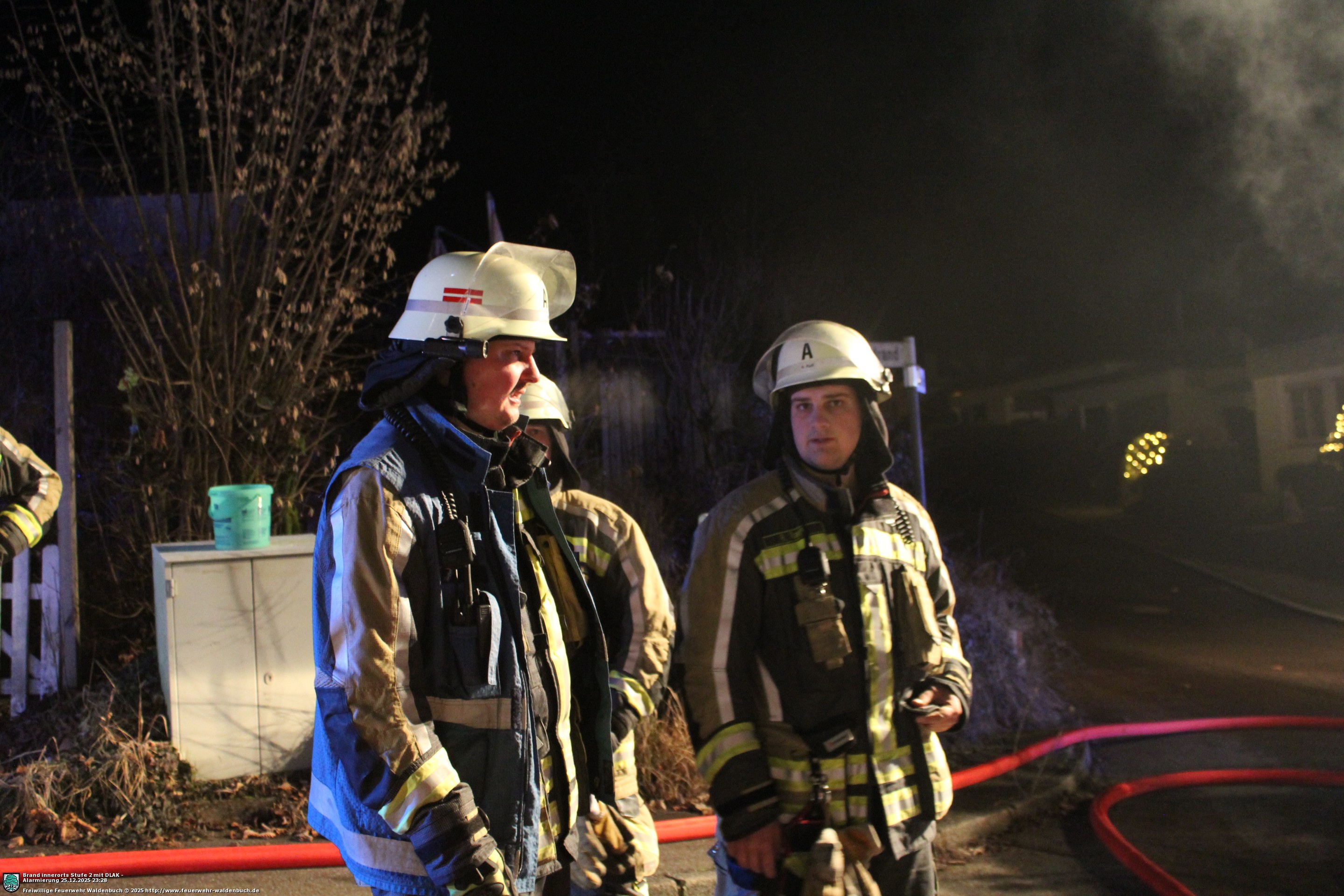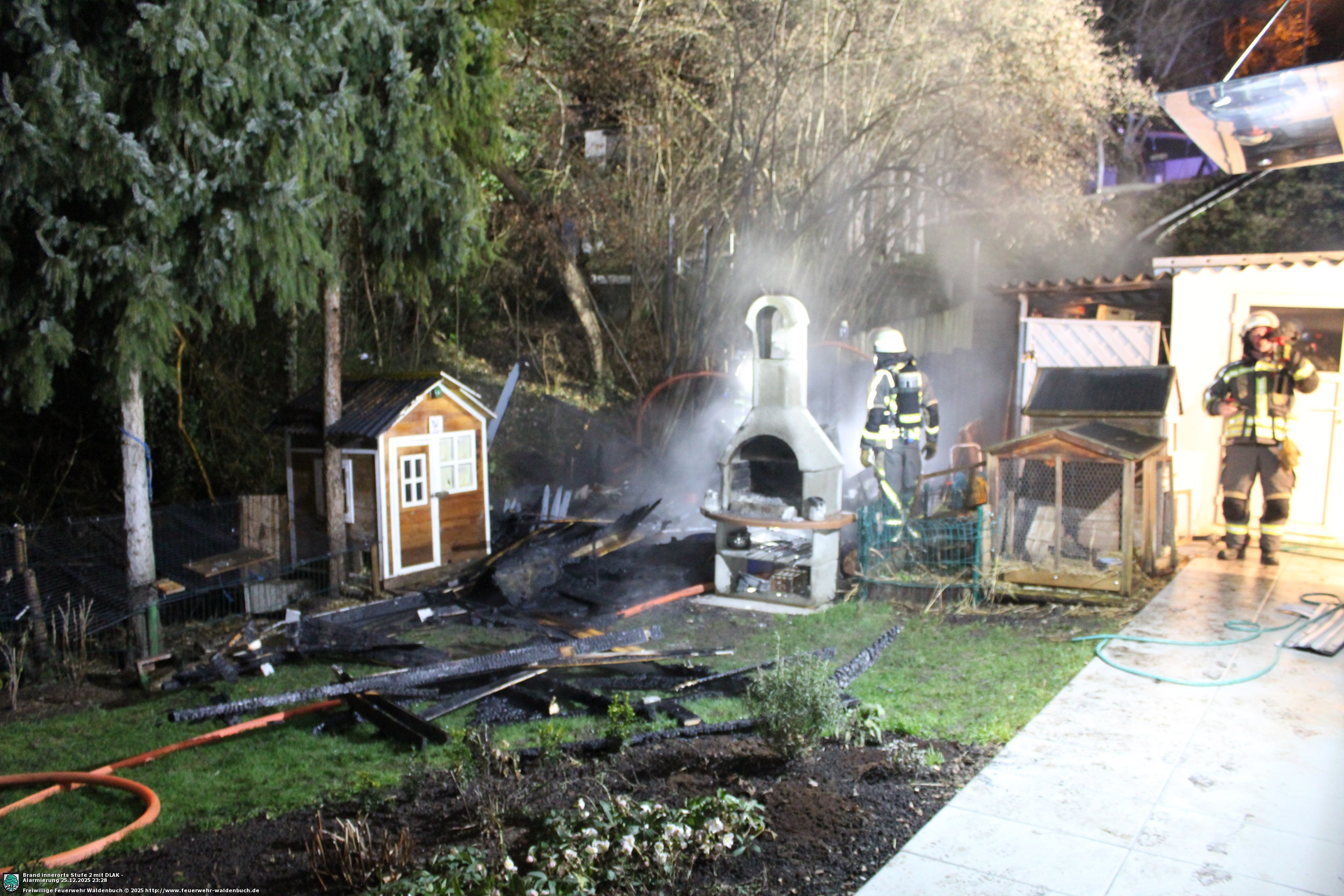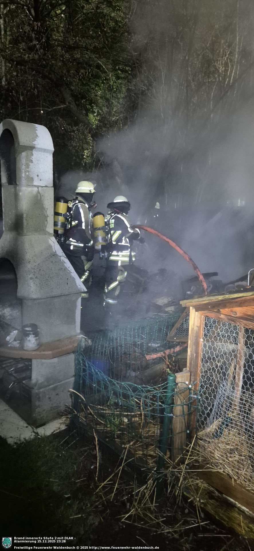 | Bericht | Die Leitstelle Böblingen alarmierte die Feuerwehr Waldenbuch zu einem gemeldeten Brand im Bereich hintere Weinberge. Nach Ankunft des Zugführers konnte ein Gartenschuppen im Vollbrand vorgefunden werden. Der Brand wurde unter Einsatz von zwei Atemschutztrupps bekämpft. Das angrenzende Wohnhaus konnte mittels Riegelstellung geschützt werden. Final wurde die Einsatzstelle mit der Wärmebildkamera überprüft und restliche Glutnester abgelöscht. |