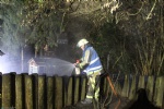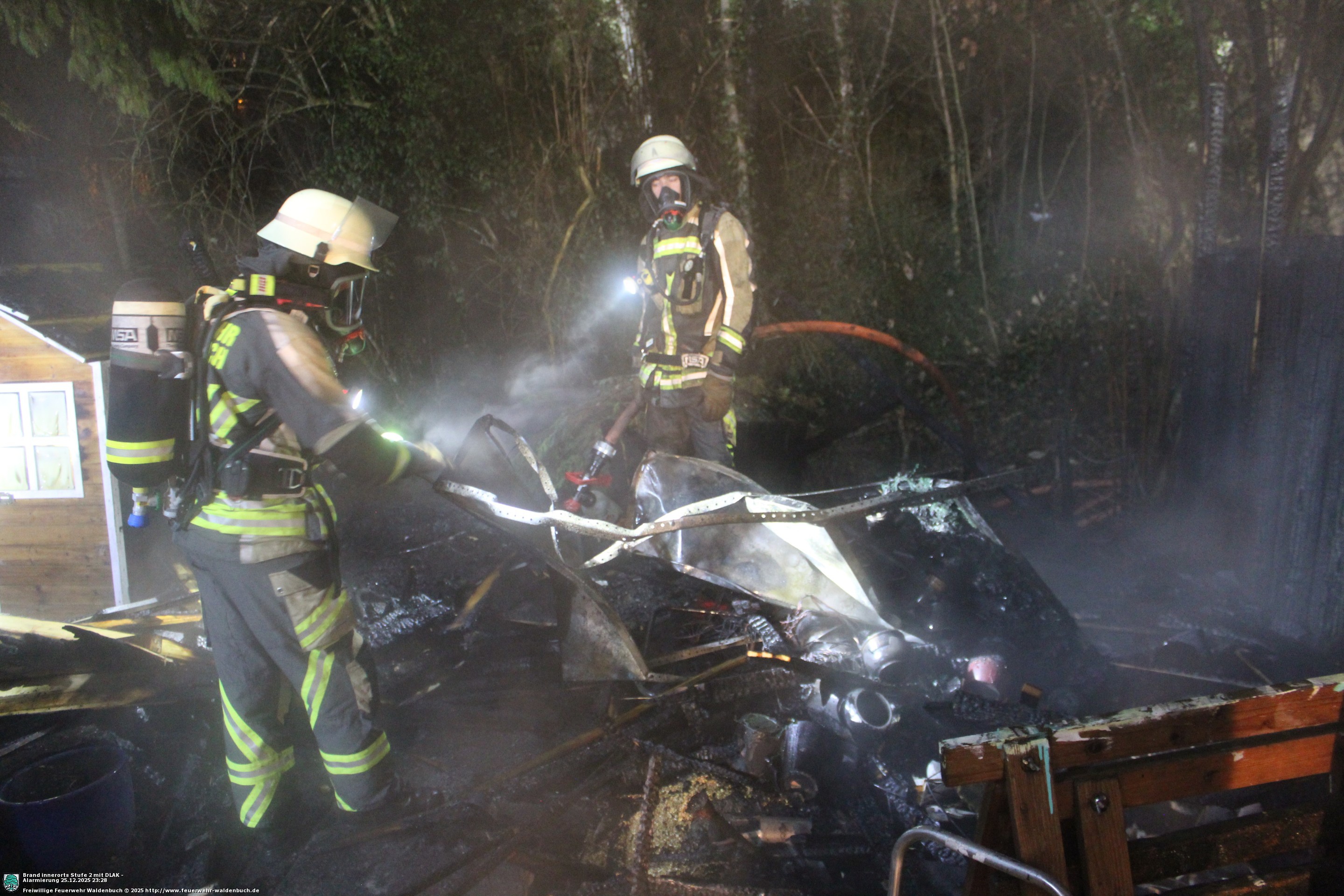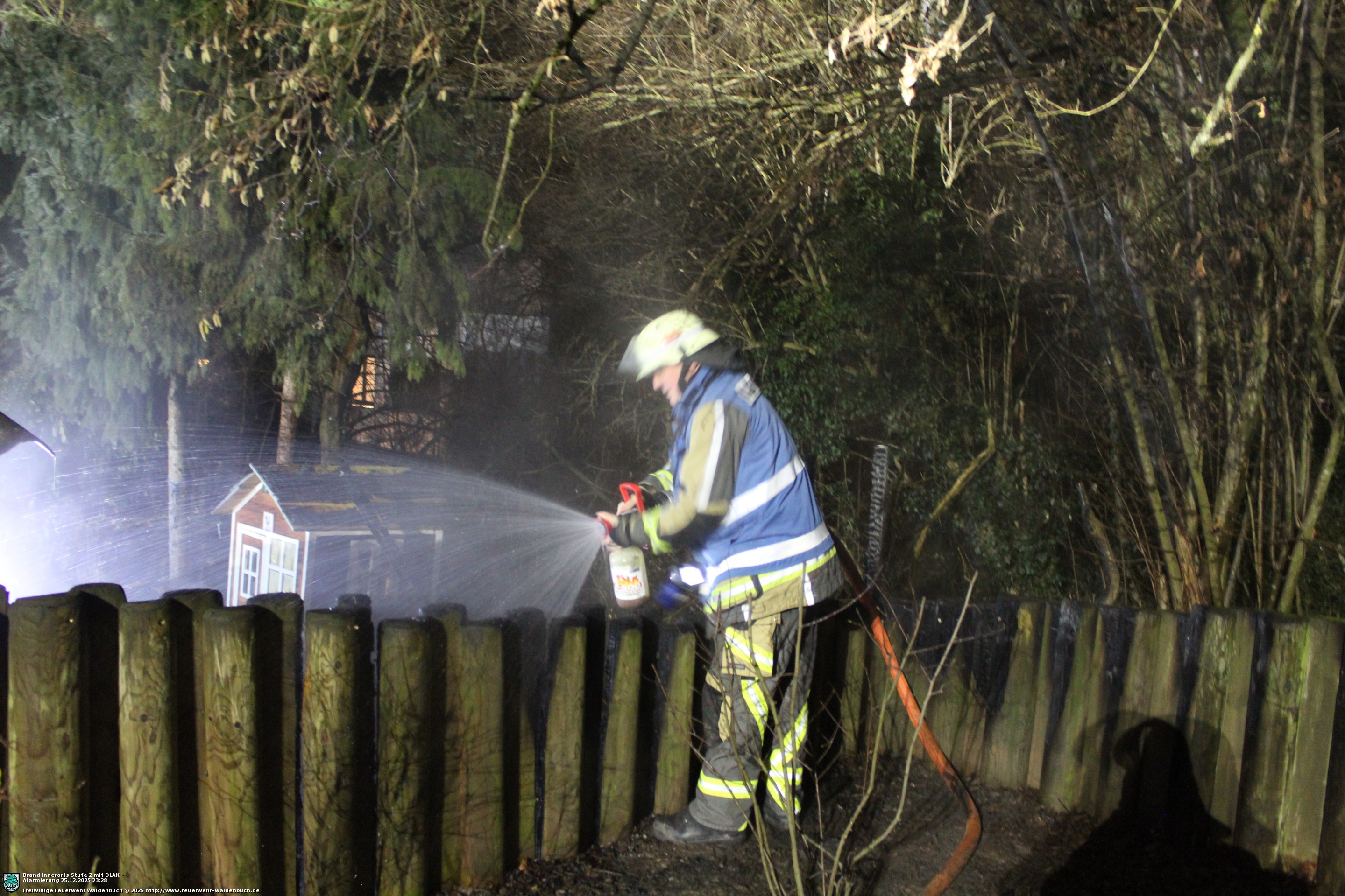 | Bericht | Die Leitstelle Böblingen alarmierte die Feuerwehr Waldenbuch zu einem gemeldeten Brand im Bereich hintere Weinberge. Nach Ankunft des Zugführers konnte ein Gartenschuppen im Vollbrand vorgefunden werden. Der Brand wurde unter Einsatz von zwei Atemschutztrupps bekämpft. Das angrenzende Wohnhaus konnte mittels Riegelstellung geschützt werden. Final wurde die Einsatzstelle mit der Wärmebildkamera überprüft und restliche Glutnester abgelöscht. |